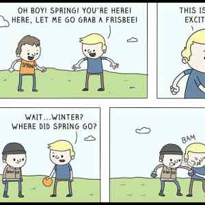 nevim kde zijes, ale u nas bylo poslednich x dni velmi teplo a ted si nekde vzpomneli, ze je furt brezen, velmi se ochladilo a je pekna kosa. strip je aktualni a nejaky vtip ma, nevim, co se ti nezda.. |