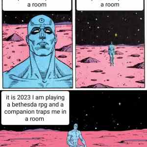 Chyba, že tvůj společník se postaví tak, že zablokuje dveře a ty se nemůžeš dostat z místnosti zřejmě přetrvává ve hrách od Bethesda Softworks od Morrowindu (2003), přes Skyrim (2011) až po současný Starfield (2023). |