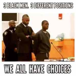 Tři negři, jeden v rámci affirmative action dostal titul právníka, druhý v rámci stejné akce je policajt. Nejsmutnější osud má ten třetí zleva, rapper Bobby Shmurda, který byl s tímhle fake právníkem vržen před bílou justici a seděl šest let za spiknutí za účelem vraždy, z čehož by ho méně pigmentovaný jistě vysekal. |