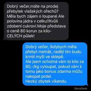 A nebo taky mohla odpovedet Orechy mame i loupane ale cena je 180,- za kilo. A mozna by mela kseft. Ale to by to nesmel bejt radoby vtipnej fejk. |