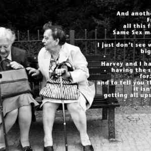 | Ne. Je to slovni hricka na same sex jakozto stejna pohlavi/stale tentyz sex (v tomto pripade se babka divi, proc je tolik povyku kolem svateb stejneho pohlavi (same sex marriage) kdyz ona mela same sex ve smyslu stale stejny sex, se svym muzem 54 let a popravde, nestalo za to, kolem toho delat takovej humbuk. | ||