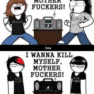 randomPN: obvious troll is ob... , i když, dokážu si tě představit, a že vskutku věříš tomu, co píšeš. Pokud nejsi troll, tak doporučuji si doplnit info o žánrech, subkulturách a kravinách kolem. Nedoporučuji jako zdroj používat blog fakt-husté-spolužačky. Pravdu máš jen v tom že "nemají texty o tom, že se chtějí zabít", to ale pro pointu obrázku důležité vůbec není. |