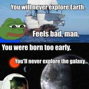 stále můžeš explore Earth. Je spousta zákoutí, ve kterých člověk nikdy nebyl a kde se mohou nacházet nepředstavitelné věci. Je to nechutně drahý, ale tak to bylo vždycky. Jediný rozdíl je, že ses dřív mohl do takové expedice najmout veslařem nebo nosičem (a po cestě chcípnout), teď na vše potřebuješ kvalifikaci. |