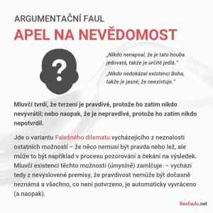 LOL, tak TOHLE je argumentacni faul: Tvrdit, ze kdyz nekdo neco nevyvratil, tak je to v mnozine mozneho. Ten priklad s bohem bije do oci. Autor asi netusi, co je to kriticke mysleni, co je to vedecka metoda a ze veda se snazi zpochybnit dosavadni poznane a ne dokazat. Protoze staci jedn jediny priklad, kdyz je to jinak a zakon neni zakon bez ohledu na myriady pripadu, kdy plati. Ostatne dosadte si misto boha treba neviditelbeho jednirozce prdiciho duhu - podle tohoto je validni hypoteza bo neni vyvratitelna |