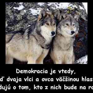 Citron: pokud vim, tak rysem (mozna ne nezbytnym) demokracie je ochrana jednotlivce a dodrzovani zakladnich lidskych (ovcich a vlcich?) prav. Je mozny, aby si vlci odhlasovali, ze ovce bude platit vyssi dane, ze pujde pozdeji do duchodu a ja nevim, co vsechno, ale tezko si muzou odhlasovat aby se z ni stala snidane. Bavim se ted o soucasnym pojeti demokracie a ne o tom, jak ji videl Aristoteles / Platon a dalsi. To je taky nesmirne zajimavy tema, ale pomerne neaktualni. |