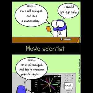 | ** Hmm... Jsem buněčný biolog. A to je biochemie... Měl bych požádat o pomoc. ** ** Filmový vědec ** Hmm... Jsem buněčný biolog. A to je fyzika subatomárních částic... Mám to. ** | ||