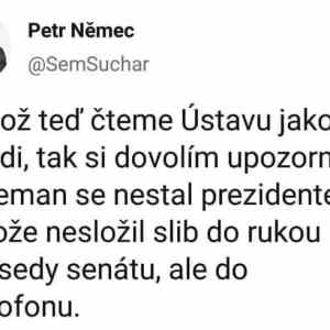 asdfasd: Zeman určitě neohybal ustavu jako Havel nebo dokonce Klaus, jmenování ministra je je špička ledovce, jmenování vlády bez důvěry, nebo to divadlo se Sobotkovou demisí, to se za předchozích prezidentů nedělo. Při psaní ústavy prostě nikoho nenapadlo psát to tam všechno doslova, včetně přesných termínů protože je nenapadlo že se najde nějaký vyčuranek který bude hledat v ústavě každý háček kterého se chytne s využije pro sebe. |