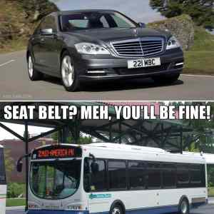 Pás v autobuse nemá veľký zmysel - pri nehode sa väčšinou vytrhnú sedadlá z podlahy - keďže nie všade sú miestenky, mŕtvoly sa podľa čísla sedadla nedajú tak ľahko identifikovať. Autobusy sú testované na prevrátenie - avšak nie crash testami, ale iba počítačovou simuláciou, kde vždy dopadnú skvele. Skutočný crash test je testovaný na ľuďoch, preto ich toľko zomrie.