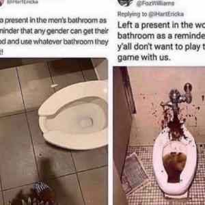 Překlad: Protože nějaký nevyrovnaný koot hodil na zem u chlapů tampon bo co, tak sebezvaný bojovník za svobodu, místo toho, aby mu dal do držky, tak přidělá doslova hromadu práce nějaký úplně cizí chudině uklizečce a stovce ženskejch, co se pak nemůžou jít vychcat. Gut job! Maskulinita zachráněna... |
