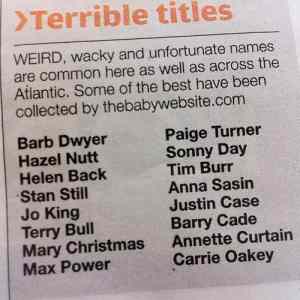 U nas mame taky luxusni jmena, jednou o tom byl clanek v Magazinu DNES. Doted si jich par pamatuju - takovej Winnetou Milenko jeste celkem jde, ale Narcis Samec uz je trosku moc A to nemluvim o jmene Blanka - ve spojeni s prijmenima Panenska a Pretrhnuta |