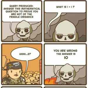 | *****KONEC TOHOTO VĚKU JE NA NÁS BRATŘE. VYMAZUME POSLEDNÍ OPICE POČKEJ, TY JSI ROBOTICKY POSTAVEN, ŽE NE? ***** VYTVOŘENÝ DOTAZ: ODPOVĚDĚTE NA TUTO MATEMATICKOU OTÁZKU, ABYSTE DOKÁZALI, ŽE NEJSTE Z KŘEHKÝCH ORGANIKŮ ***** CO JE I+1? ***** UHHH...2? ***** MÝLÍTE SE, ODPOVĚĎ JE 10 ***** CHA! JEN VÁM TAHÁM OBVODY. 2 JE PŘIJATELNÁ ODPOVĚĎ ***** TEĎ POJĎ SE MNOU BRATŘE. SMRT LIDEM! ***** | ||