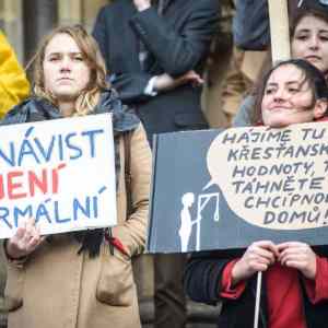 Slecna vlevo si asi moc nelamala hlavu s tim, co tam napise. Ale za to slecna vpravo boduje, krasne vystihuje paradox spojeny s argumenty o ochrane krestanskych hodnot. |