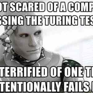 Čo roumenista to nerd, vy by ste sami ten Turing test nedali, zasekli sa v nejakej logickej slučke. Pointa obrázku je v tom, že hrozbou nie je inteligentný stroj, ale stroj s bočnými úmyslami, ktorý dokáže klamať. |
