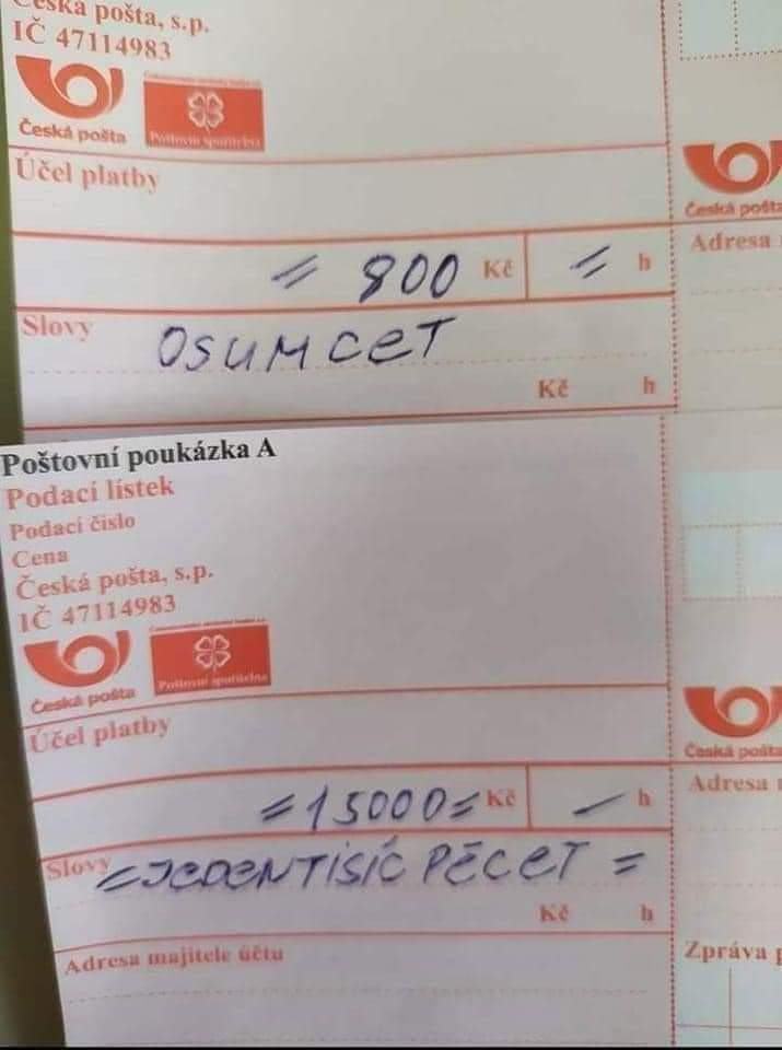 tyjo to fakt je jo? tak to priste nakreslim hovno a slovy napisu kolik to je, to se bude baba za pultem divit a pak jeji sefova a pak vedouci posty a pak az reknu ten zakon, ktery jeste neznam |