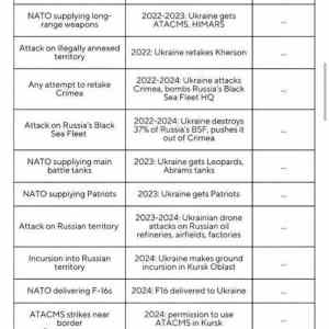 Na začátku jsem si to kompiloval taky, ale proč, když je to tu,ol ověřený a bez vlivu proruských editorů v ČR: https://en.m.wikipedia.org/wiki/Red_lines_in_the_Russo-Ukrainian_War |
