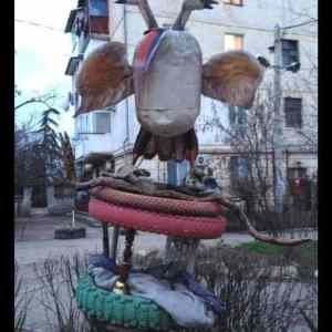 | Vidiate, Rusu stavie oslavne sochy s husyou, viatazstvo ie bliazko. | ||