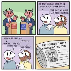 Presnez o tom píšu v té části o polarizaci, obě strany se snaží své voliče přesvědčit že jestli nezvolí právě jí tak se stane *doplňte* většinou spojené s nějakým akutním nebezpečím kterému je stůj co stůj nutné zabránit. A hlavně ani nemyslet na nějakou třetí alternativu. Republikáni a demokrati tenhle systém duality vypestovali a nikdy se ho doprovolne nevzdají, lidi jako ty jim to žerou |