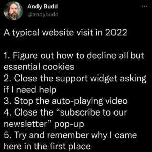 Je veřejné tajemství, že většina webů ukazuje ty debilní otázky na cookies v momentu, kdy je má dávno načteny. Celé je to naprostá kravina, měly by to řešit prohlížeče samy o sobě. Bez addblocku už je většina webů nepoužitelná, občas je pro zobrazení obsahu skrytého pod něčím dementním nebo rychlé odstranění blikavé reklamy dobré použít rozšíření Chrome Click to remove element. A bude hůř, už se zmrdi učí dělat reklamy přes CSS. |